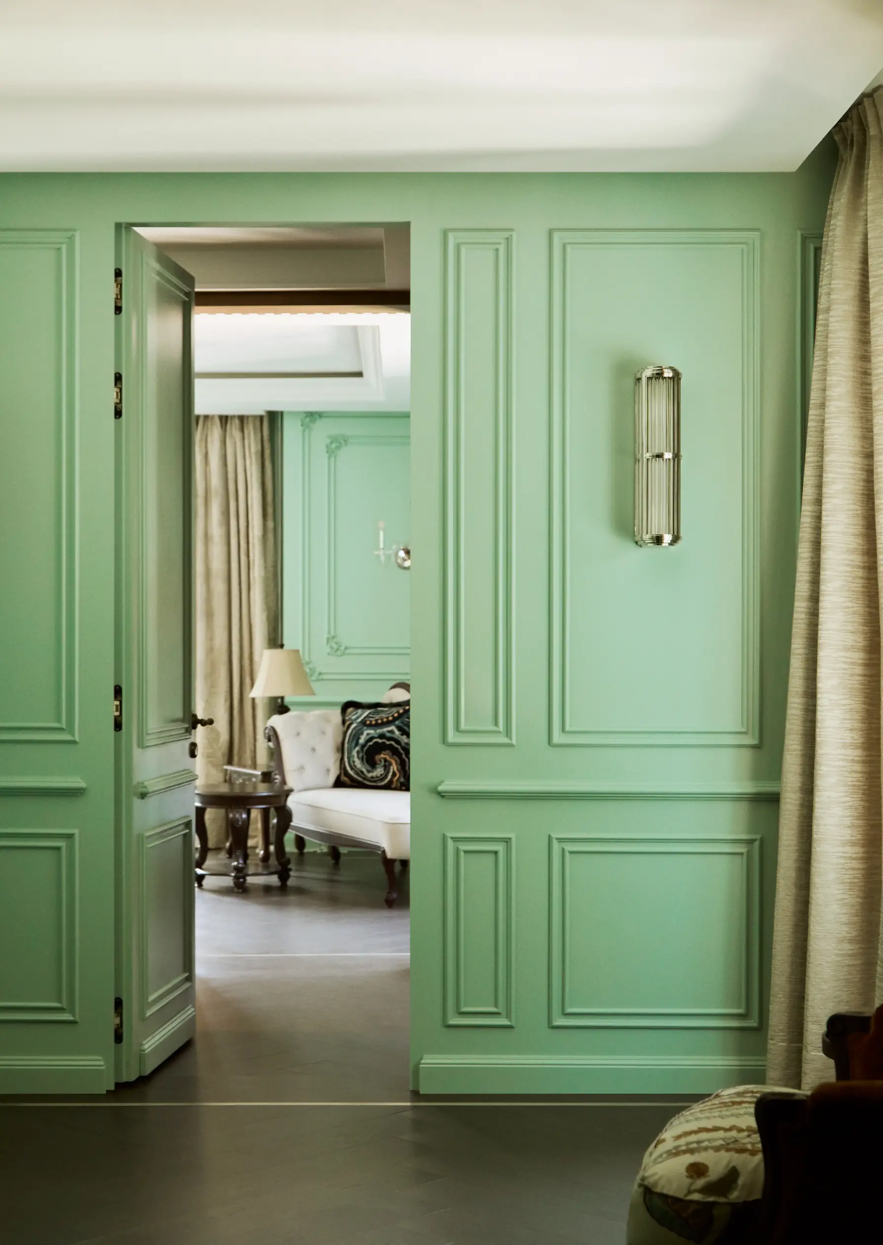 Rather than overt coastal clichés, the design embraces a quietly sophisticated palette rooted in European restraint. Soft tones of green flow throughout the residence, creating a serene and harmonious atmosphere that amplifies natural light and enhances the home’s generous volumes. These hues unify the interiors while reinforcing the estate’s identity as a European-inspired sanctuary shaped by precision, proportion, and calm.